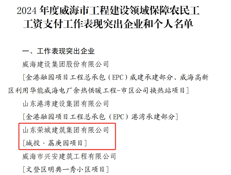 我司城投?荔庚園項目榮獲2024年度威海市工程建設(shè)領(lǐng)域保障農(nóng)民工工資支付工作表彰