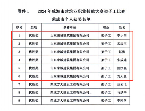 2024年6月21日,由威海市人力資源和社會保障局、威海市總工會、威海市住房和城鄉(xiāng)建設局主辦,威海市建筑工程服務中心、臨港區(qū)住房和城鄉(xiāng)建設局、威海市建筑業(yè)協(xié)會承辦的2024年度威海市建筑業(yè)架子工職業(yè)技能大賽在環(huán)翠區(qū)萬禾書院項目部舉行。比賽現(xiàn)場,23支隊伍的69名參賽選手穿著整齊的工作服,頭戴安全帽,身著工服,精神飽滿,動作嫻熟,有條不紊的進行一系列工藝操作,展示著扎實的專業(yè)功底和豐富的技能經(jīng)驗。經(jīng)過數(shù)小時的激烈角逐,我司架子工代表李小明、孟慶玉、趙勇、朱成建、侯漢強、劉天良獲得優(yōu)勝獎,公司獲得團體三等獎的好成績。